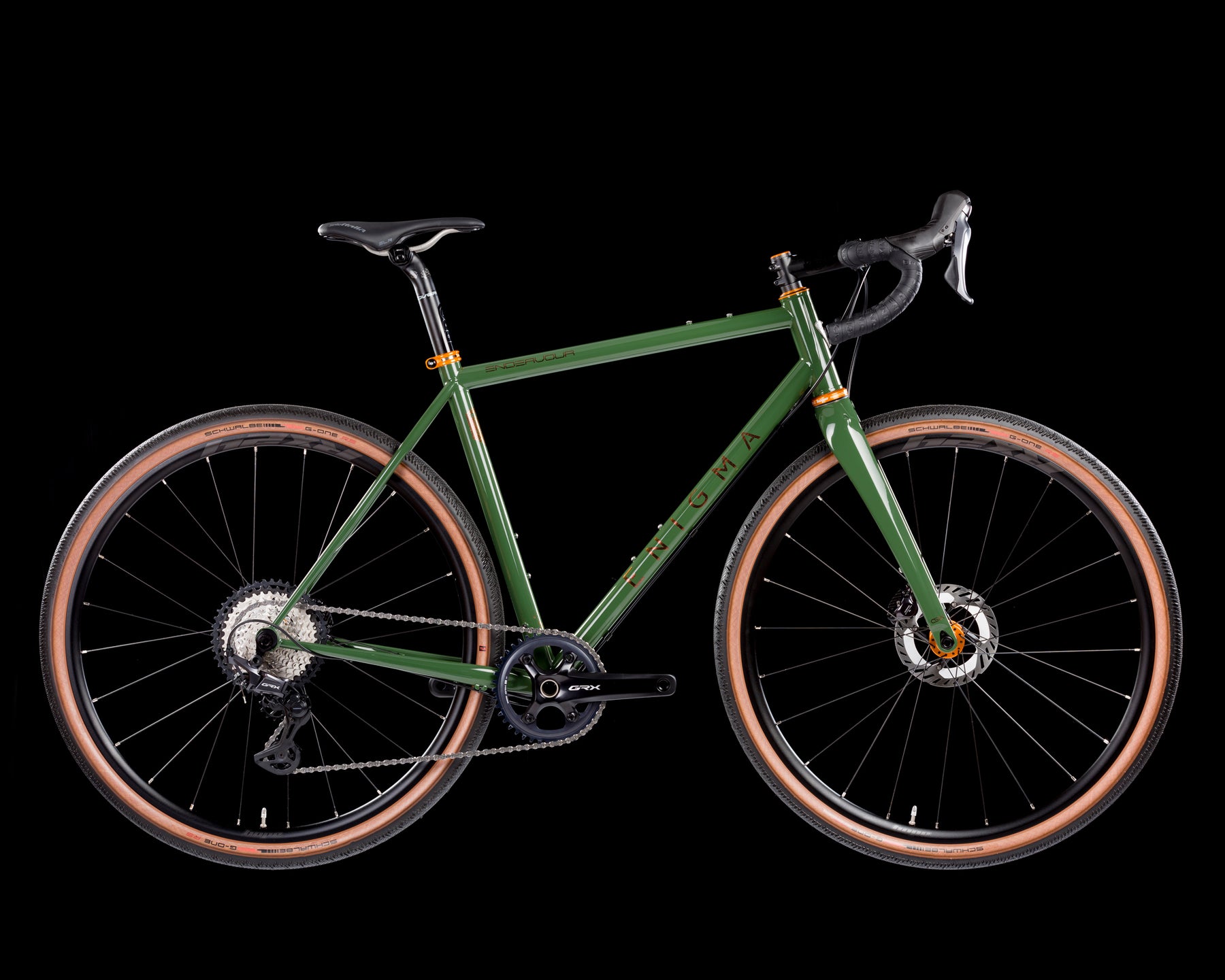 Enjoy 20% off this stunning Endeavour, finished in a rich deep-green paint scheme with contrasting orange branding and matching parts. The bold colour combination perfectly complements the frame’s timeless design and Enigma’s renowned attention to detail.