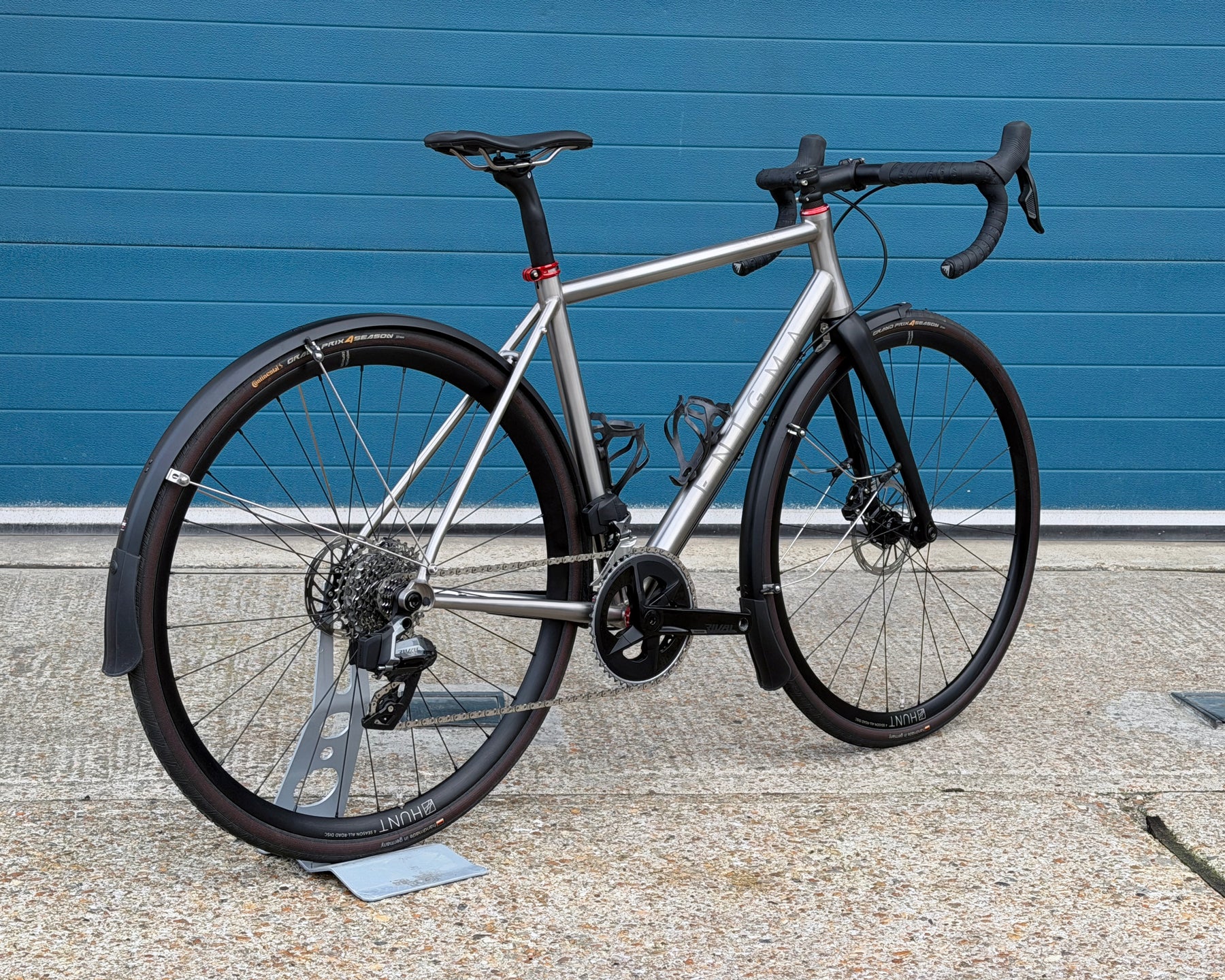 This 54cm bike was originally used for website photography and has since served as a demo. Finished in a refined brushed titanium with bead logos, it blends durability, comfort and classic Enigma styling for year-round riding.