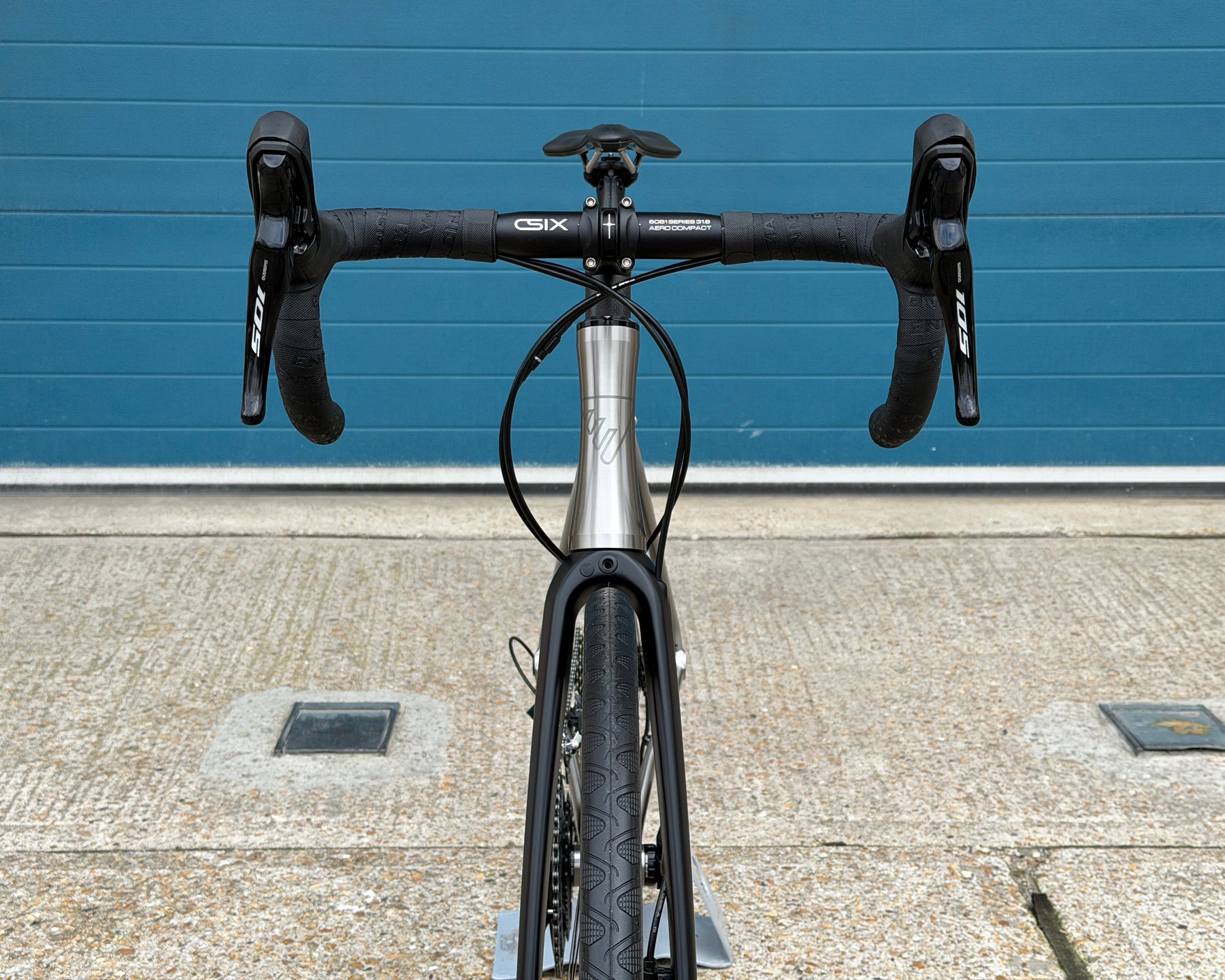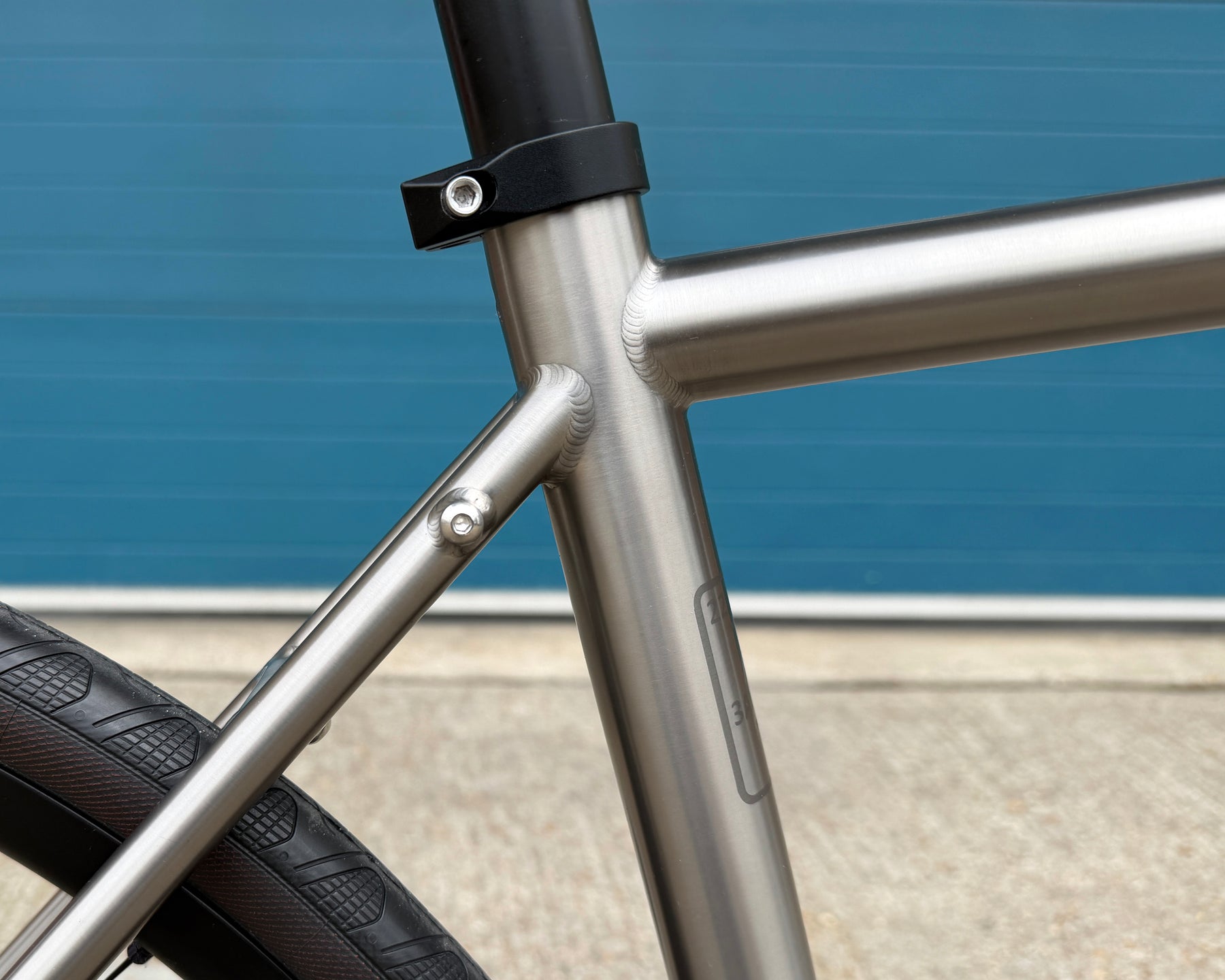 This 54cm bike is an ex display. Finished in a refined brushed titanium with bead logos, it blends durability, comfort and classic Enigma styling for year-round riding.