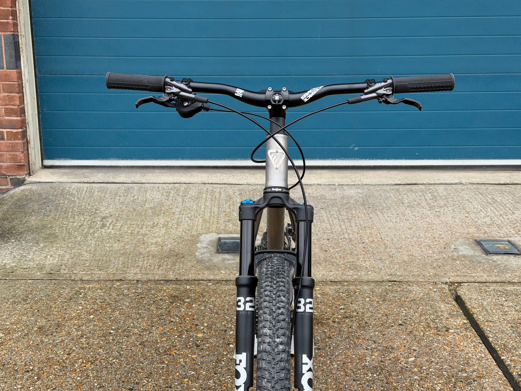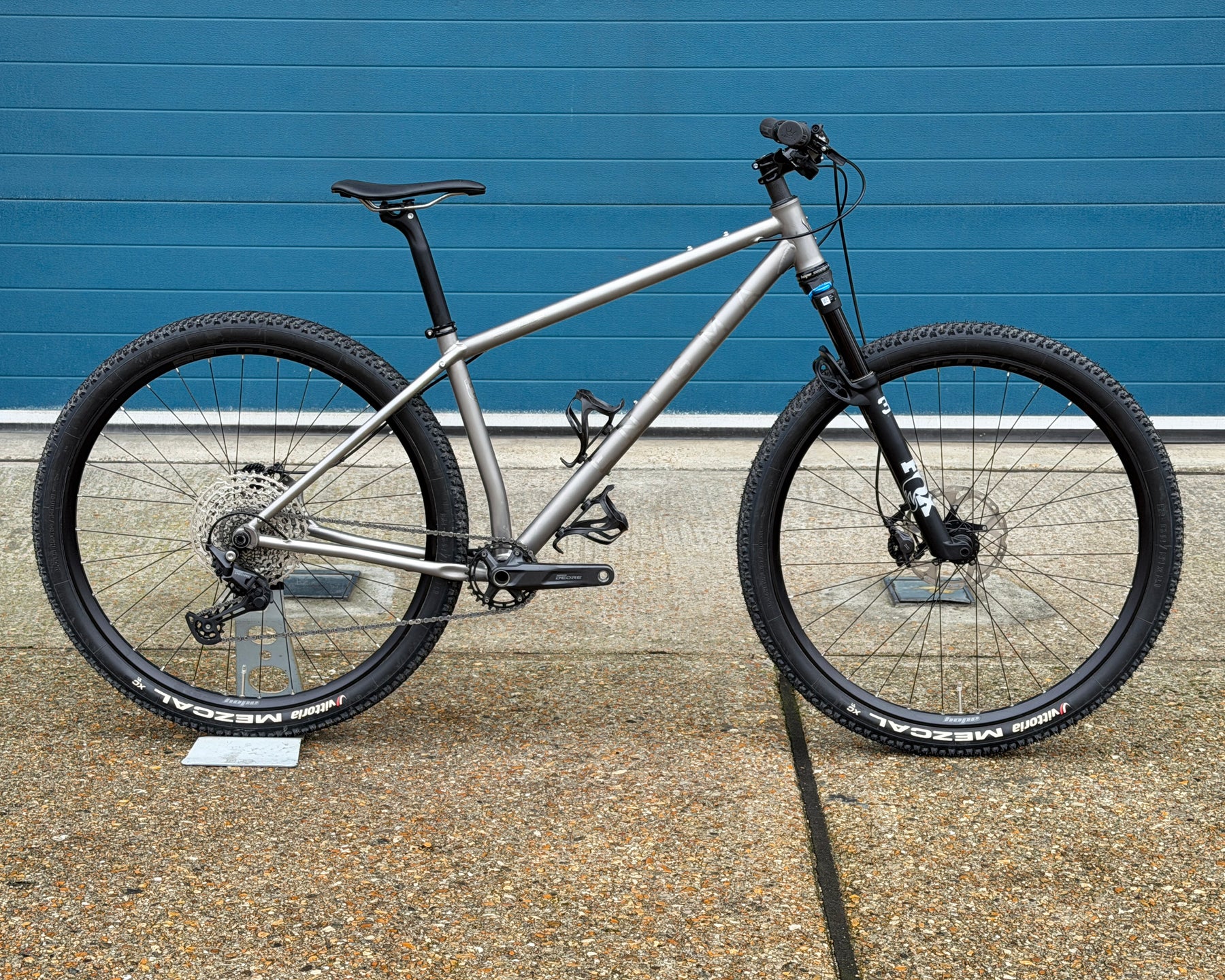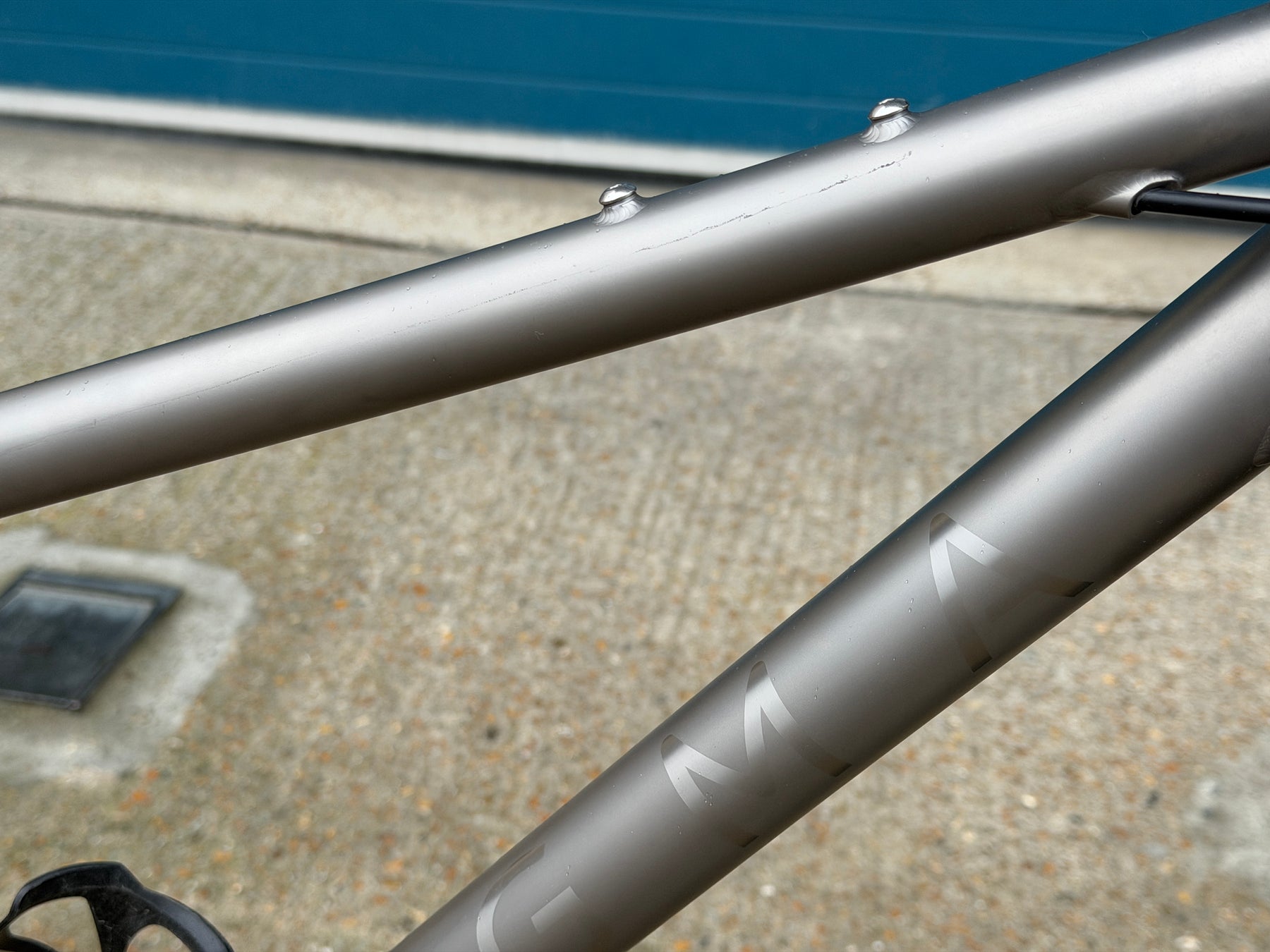 This medium-sized demo bike has been lightly used for demonstration and testing but remains in excellent condition. Finished in a raw titanium with brushed Enigma logos, it showcases understated style and Enigma’s renowned craftsmanship.