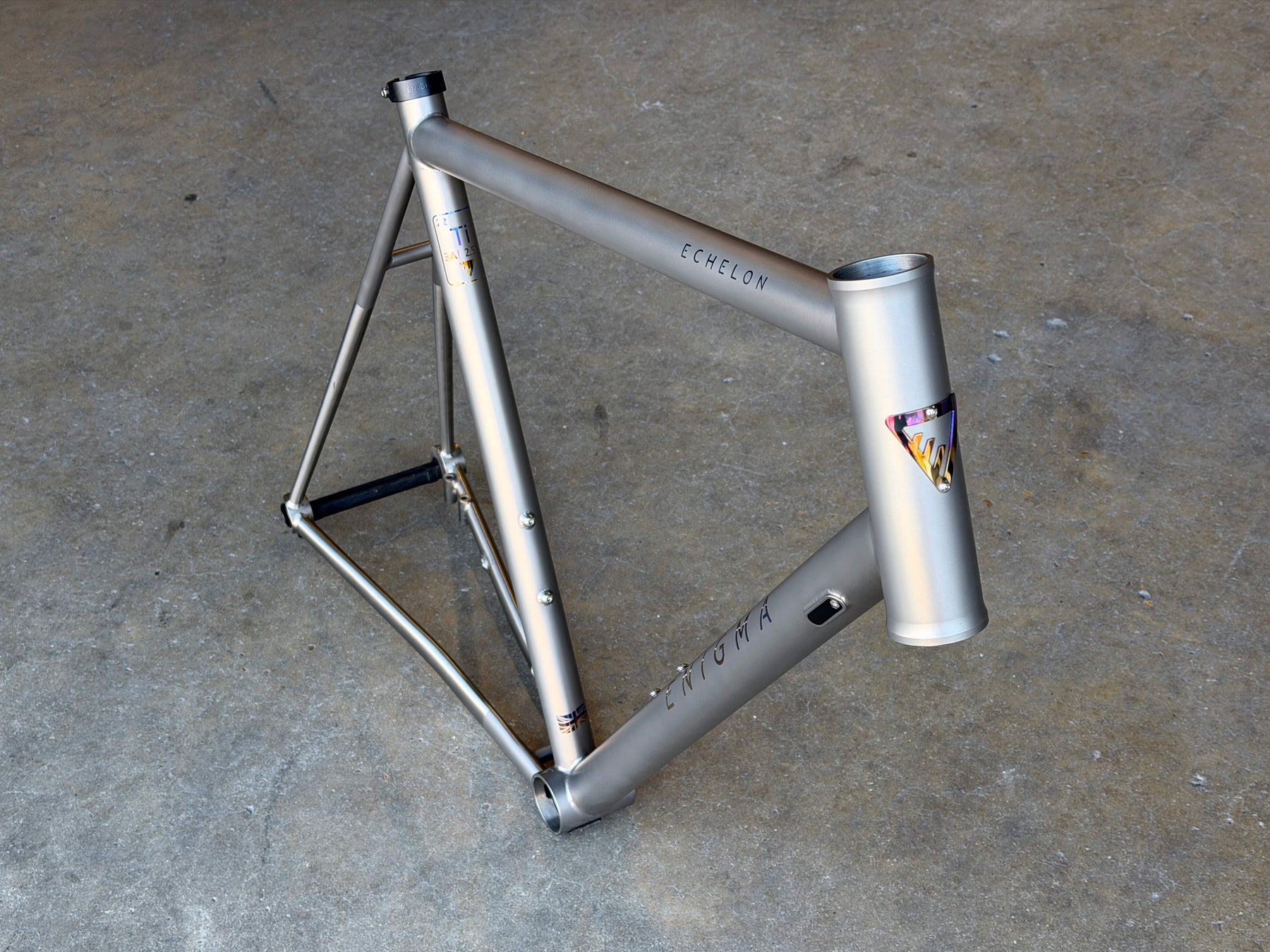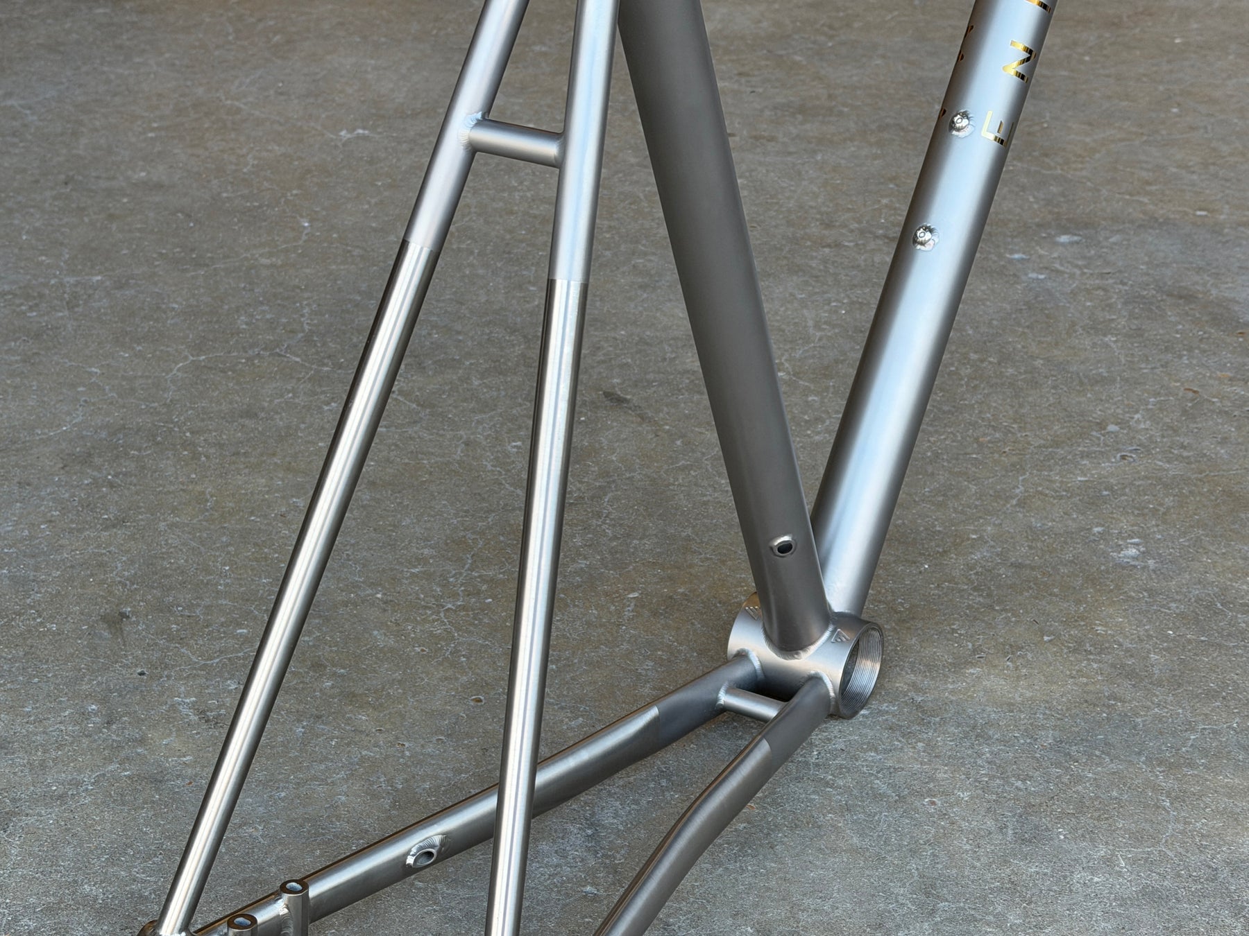 Constructed from custom 3Al/2.5V titanium tubing, the Echelon delivers a perfect balance of stiffness, comfort, and control. With clearance for up to 35mm tyres, a custom T47 68mm bottom bracket, and internal cable routing for a clean, modern finish, it’s a pure road frame built for those who appreciate refined performance and timeless design.
