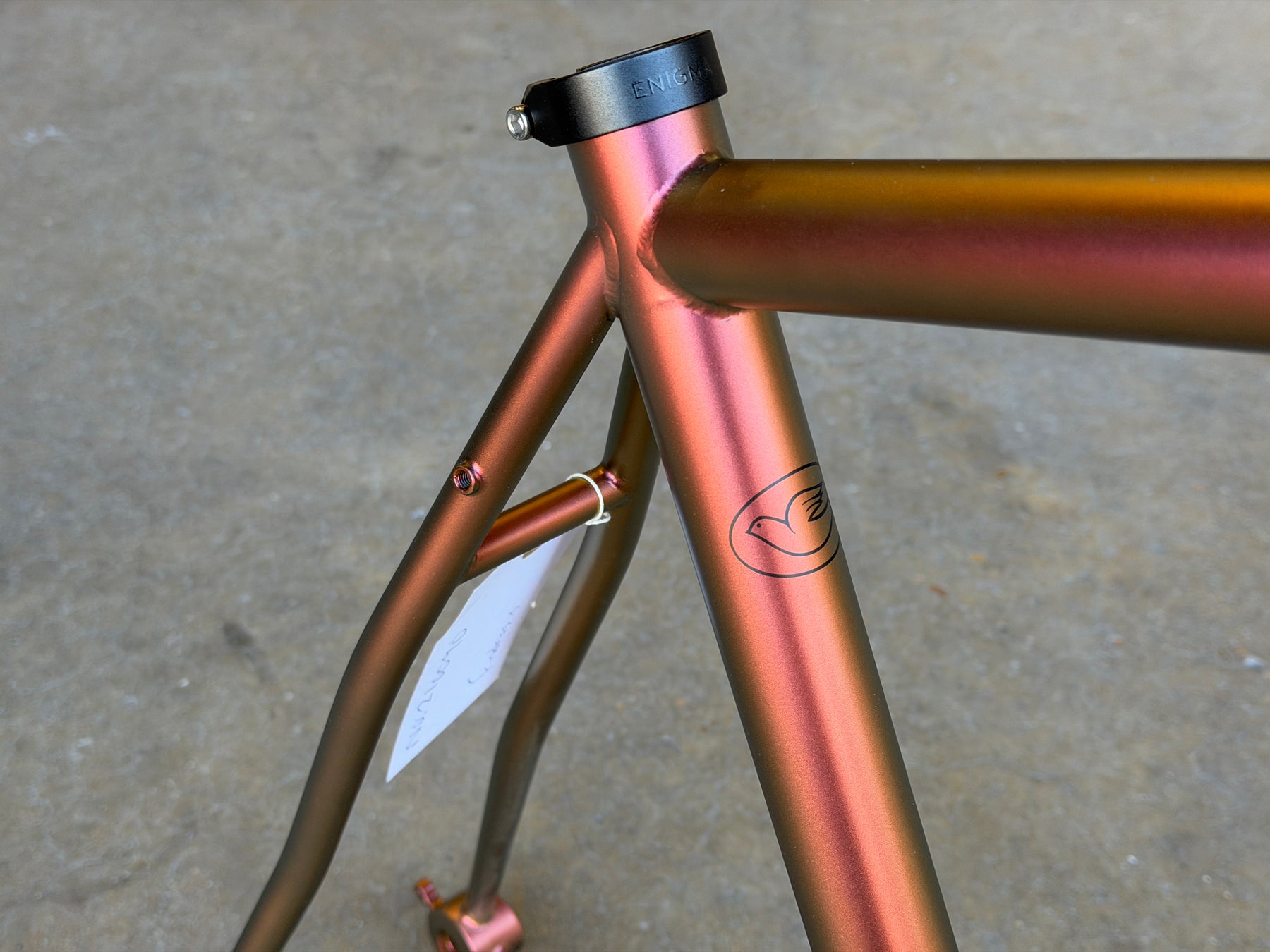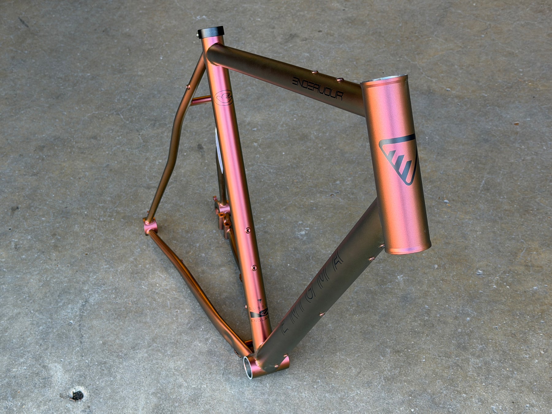 The Enigma Endeavour is our versatile steel adventure frame, designed for long-distance exploration, bikepacking, and year-round riding. Handcrafted from premium Reynolds 853 steel and finished in a stunning burnt orange paint scheme, the Endeavour combines classic craftsmanship with modern practicality for the perfect balance of comfort and durability.